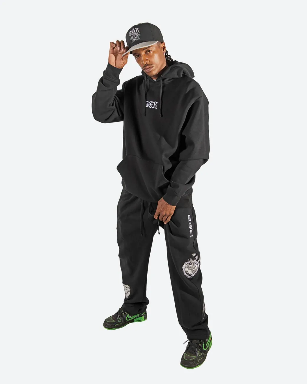 80% Cotton 20% Poly Fleece / Pullover Classic Style Hood / 380gsm Heavy Weight Fleece / Small Chest Embroidery Art / Multiple Back Embroidery Art / Lower Front Pouch Pocket Elastic Cuffs and Hem / Drawcord Hood
