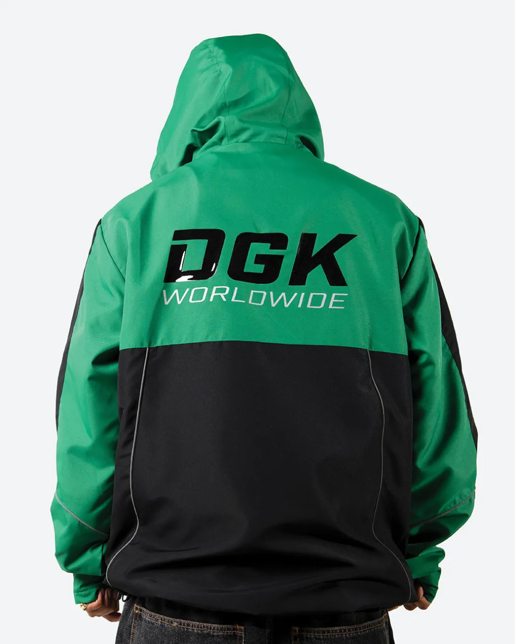 100% Poly Windbreaker / Full Zip Hood Style / Water Resistant Coated Fabric / Color Block 90s Style / Mesh Body Lining / Front and Back Logo Art / Adjustable Hood and Hem / YKK Front Zipper / Silver Reflective Piping Detail / Lower Front Pockets