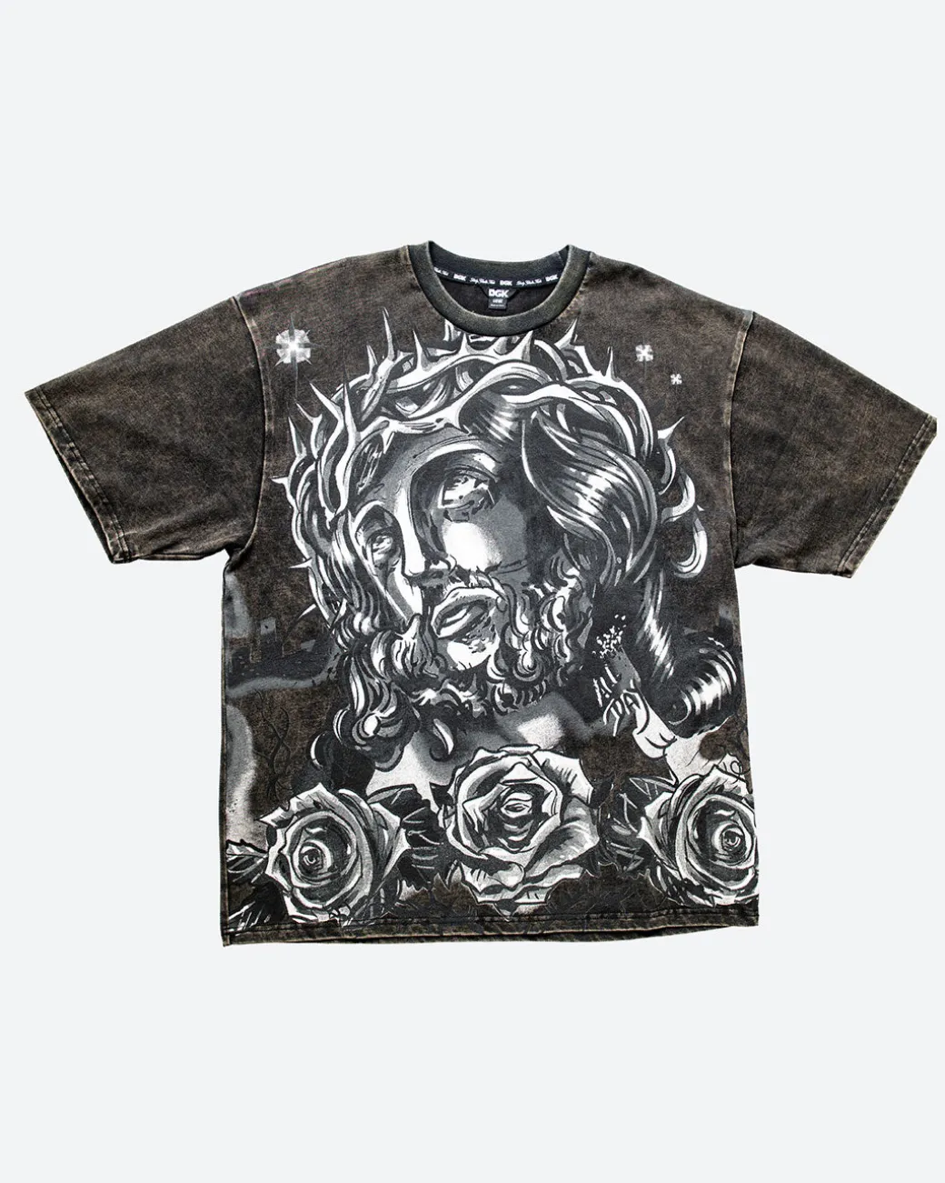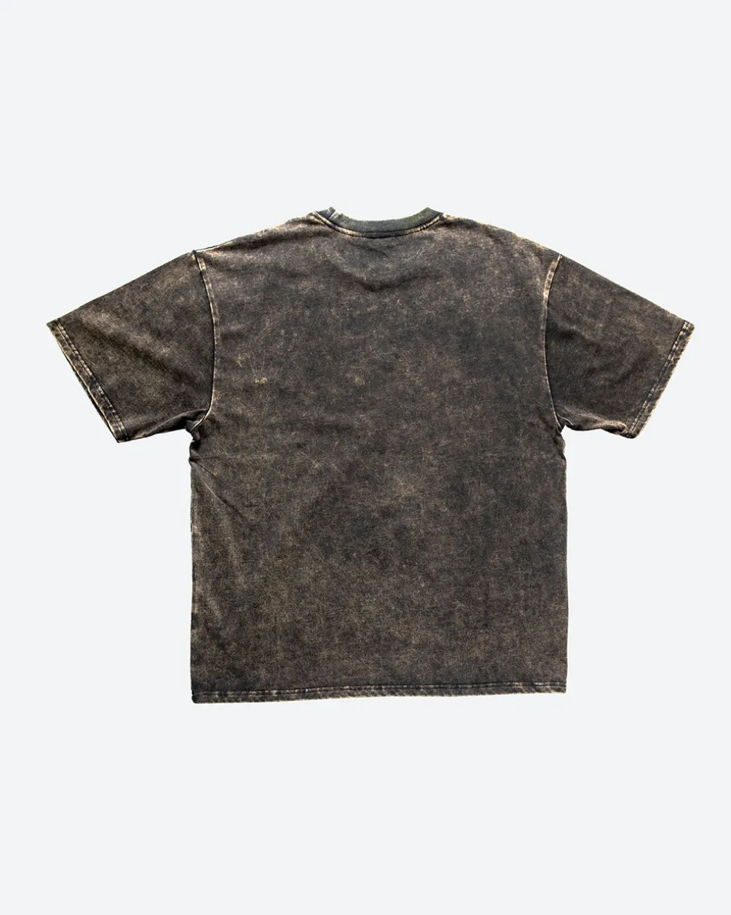 S/S Knit / Color: Washed Black / 100% Cotton Jersey / Boxy Fit / Pigment Wash Vintage Look Knit / Full Front Panel Art