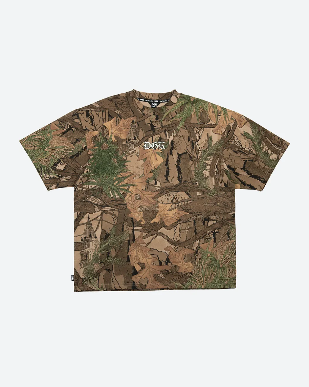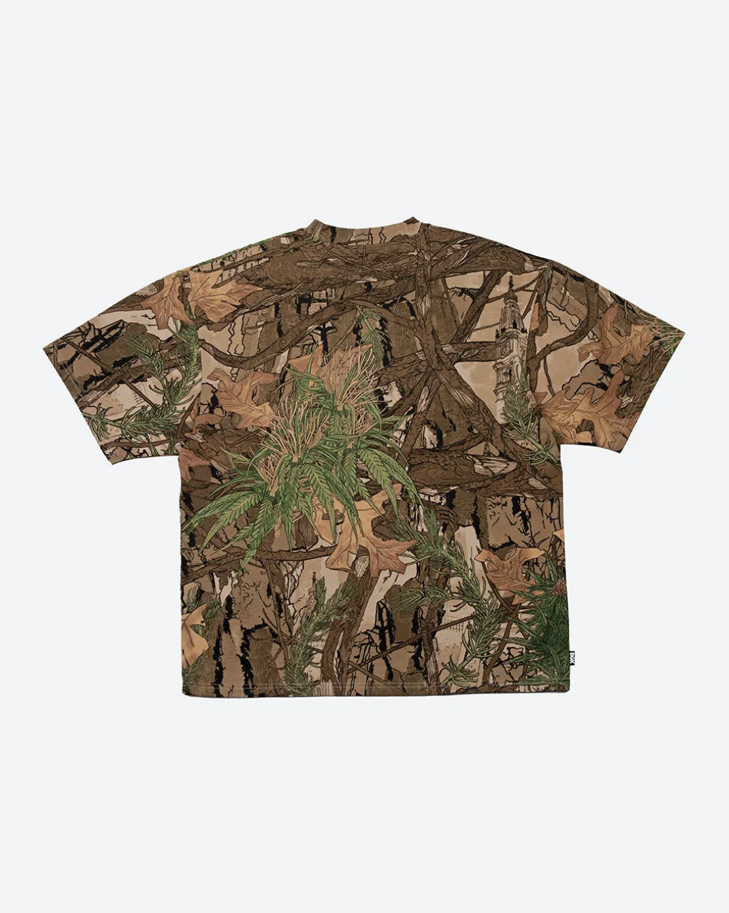 Color: Camo / Cotton Poly Blend Woven Short Sleeve / Boxy Fit / Dual Chest Pockets / Small Front Embroidery