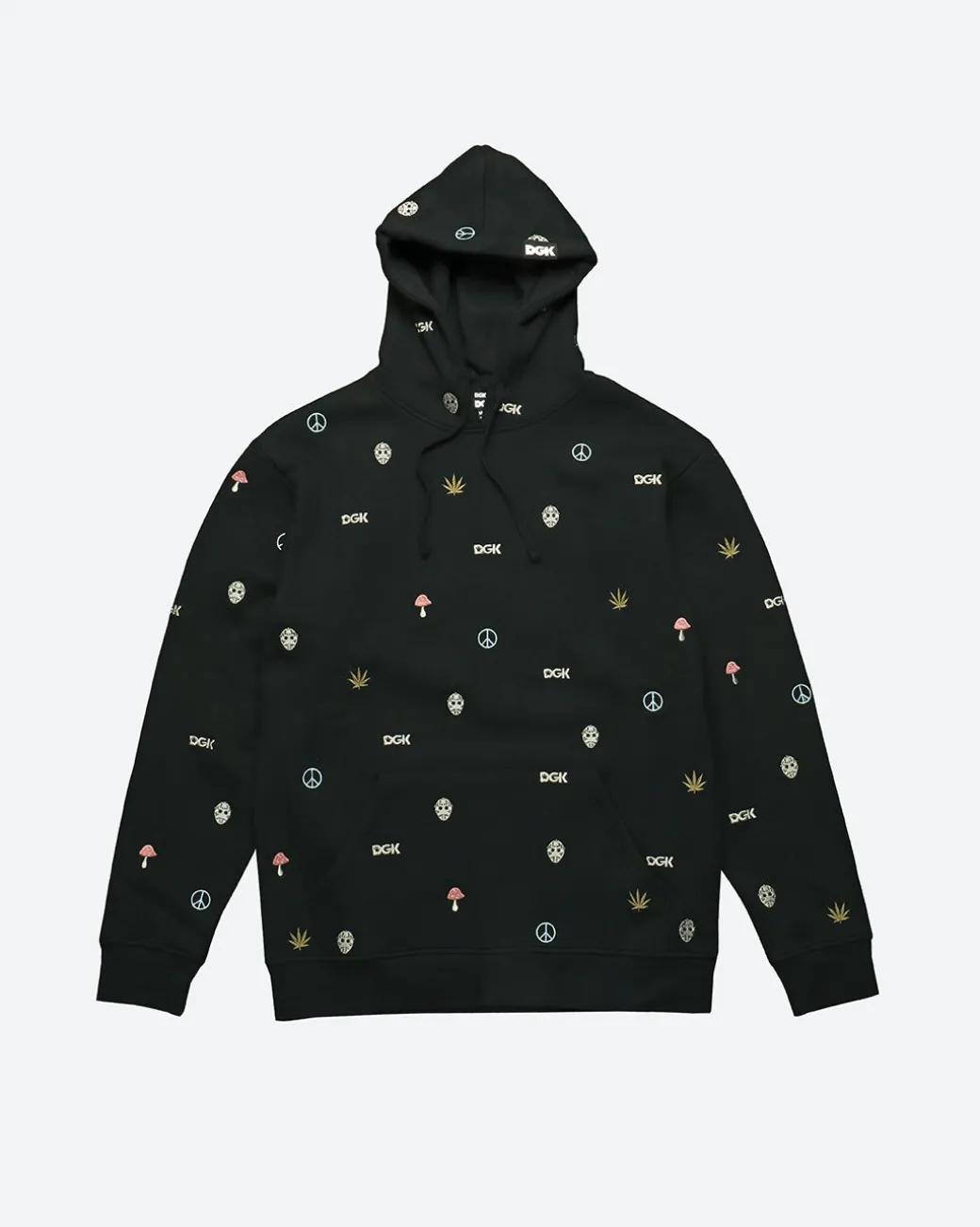 80% Cotton 20% Poly Fleece / Pullover Classic Style Hood / 380gsm Heavy Weight Fleece / All Over Embroidery Art / Lower Front Pouch Pocket / Elastic Cuffs and Hem / Drawcord Hood