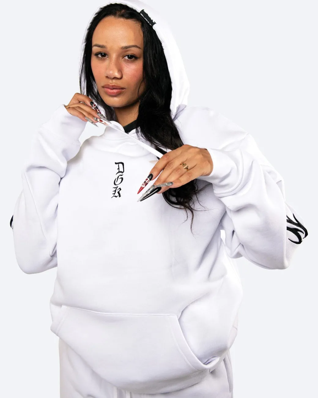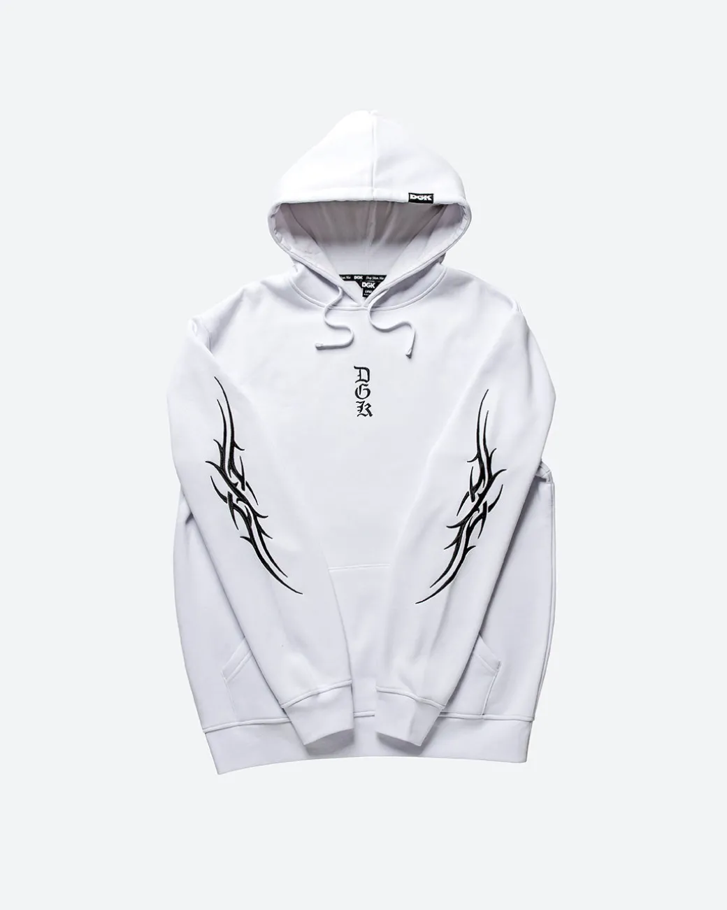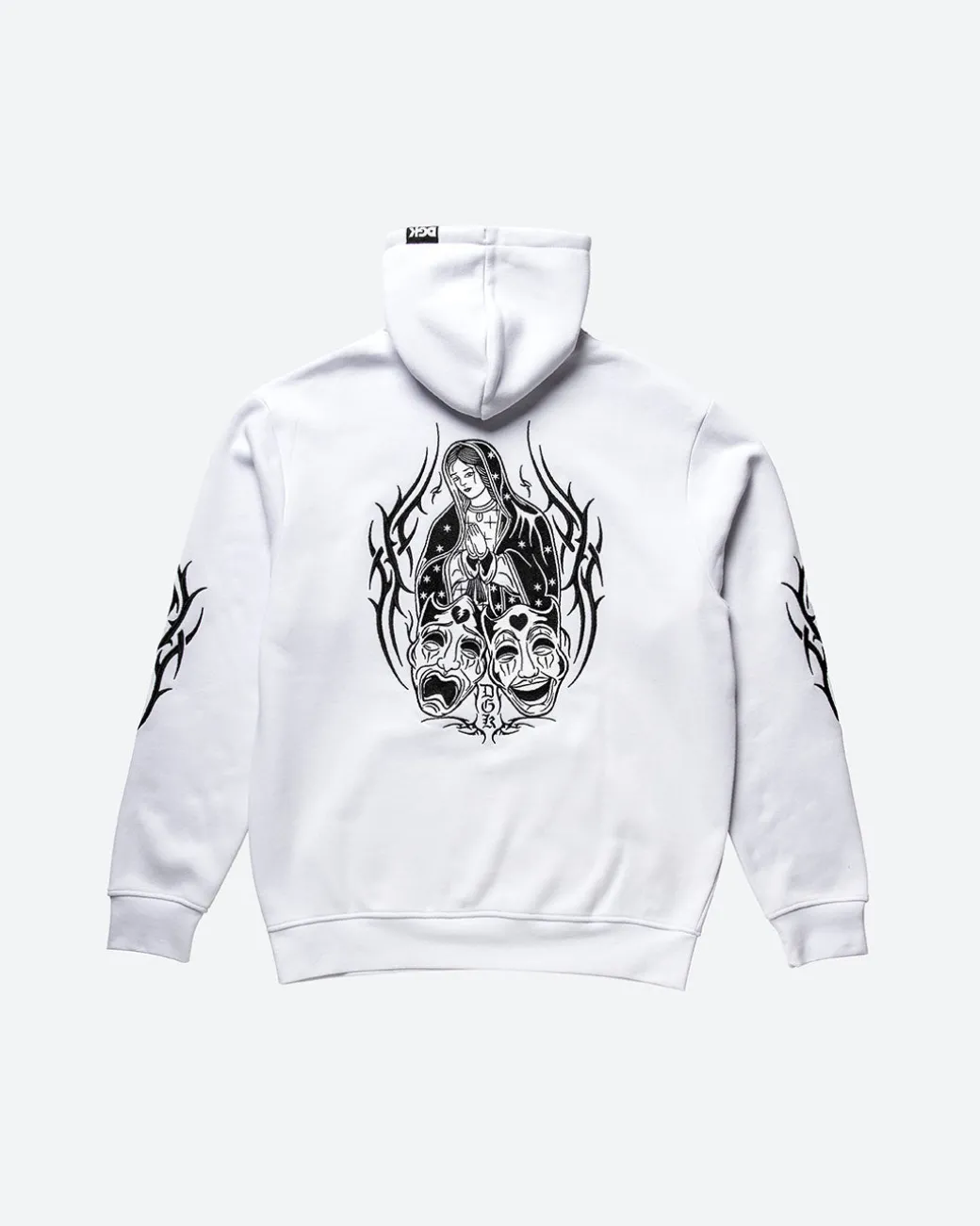 Hooded Fleece / Color: Black and White / 80% Cotton 20% Poly Fleece / Pullover Classic Style Hood / 380gsm Heavy Weight Fleece / Small Chest Embroidery Art / Back Embroidery Art / Arm Embroidery Art / Elastic Cuffs and Hem / Drawcord Hood