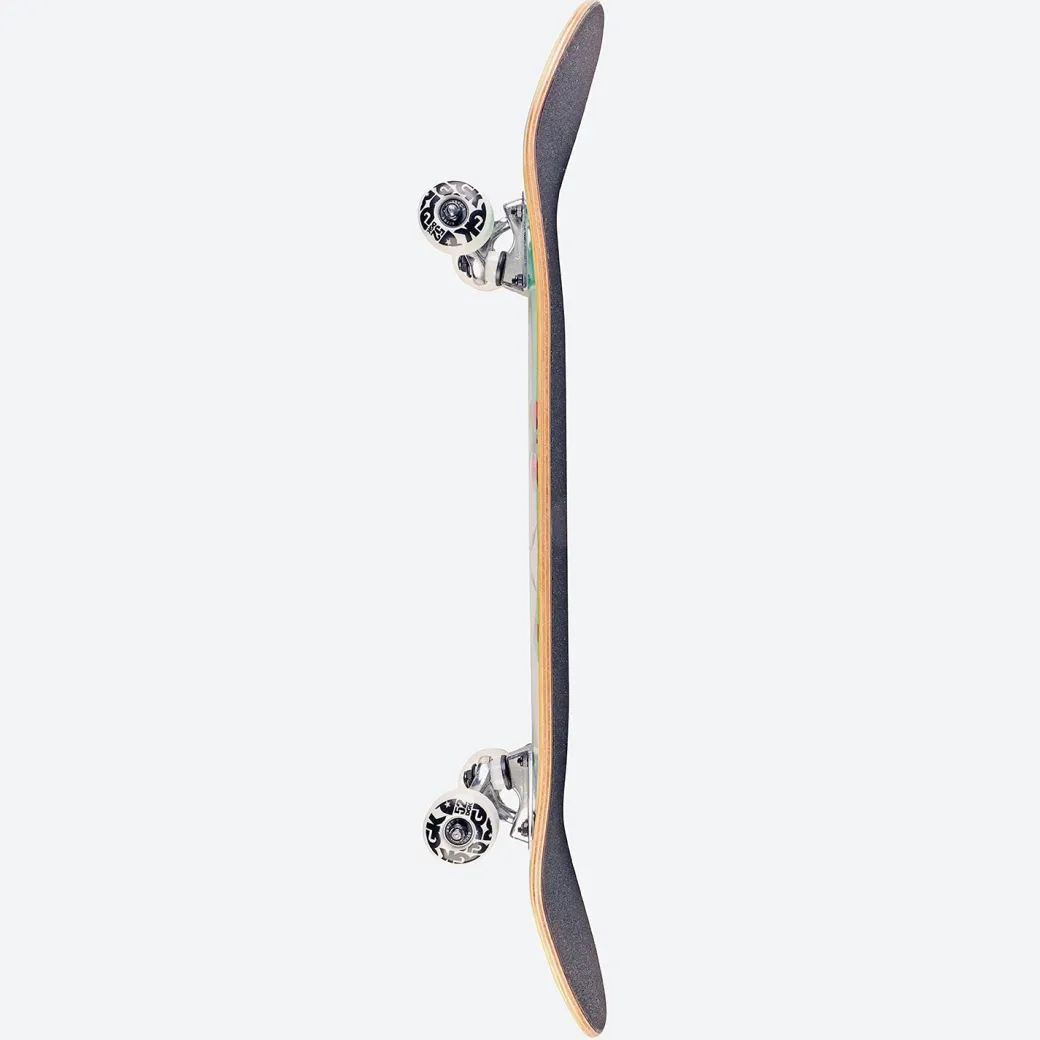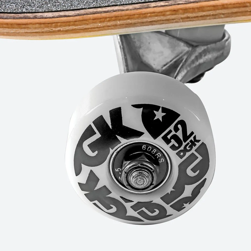 7-ply Maple with assorted stain veneers / 5.0 Raw Finish Trucks / 52mm 100a Duro / Abec-5 Bearings / Black Standard Grip