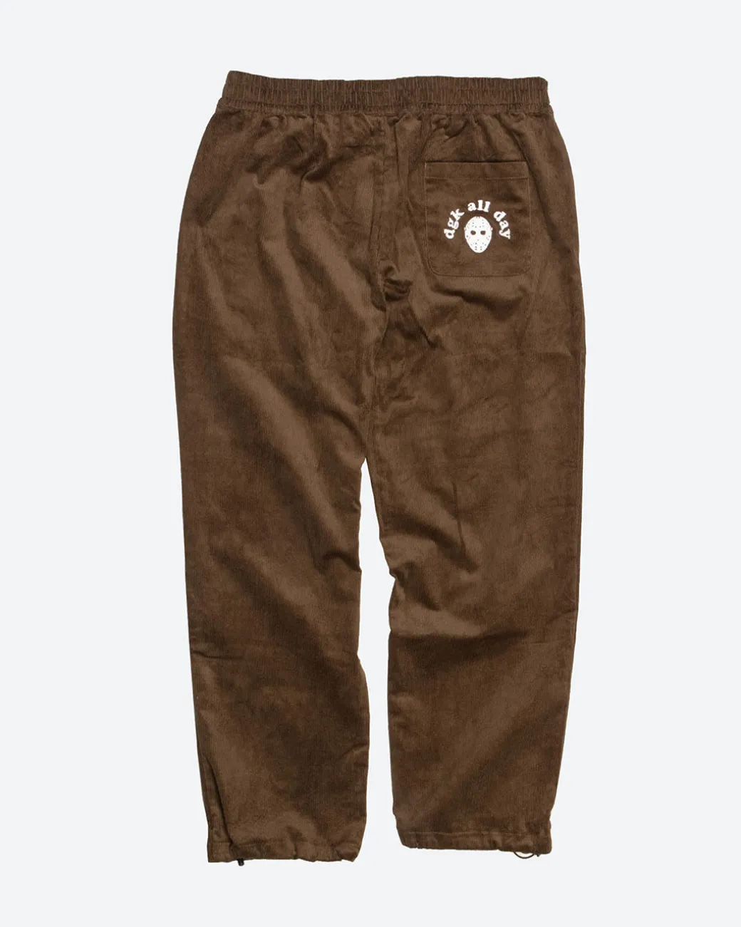 100% Cotton Corduroy or Denim / Loose Fit Pant / Embroidered Back Pocket / Elastic Waistband with Drawcord / Hidden Cuff Closure