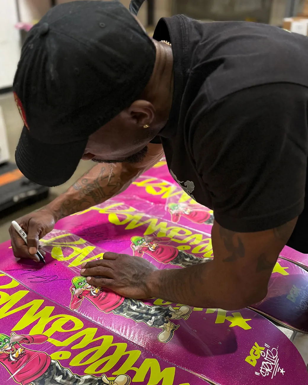 7-ply Maple with Assorted Stain Veneers / Glitter Flake Background Paint / Top Screen Graphics / Stevie Williams Professional Endorsed & Autographed Skateboard / Each Autograph is unique and might not reflect exact position as shown