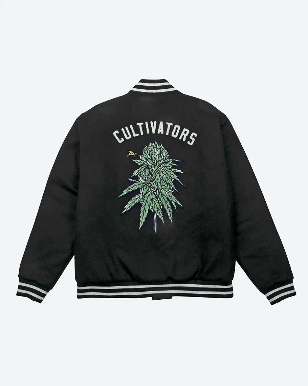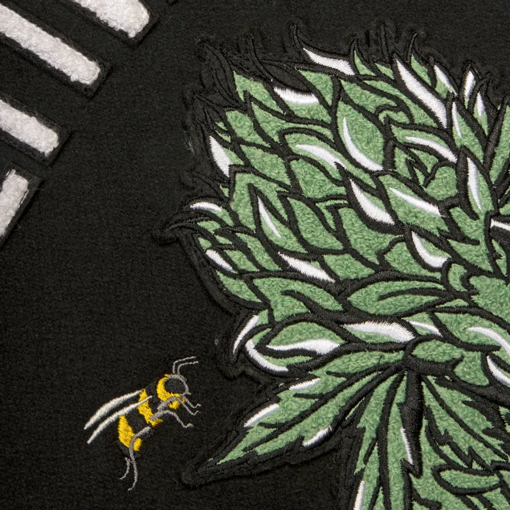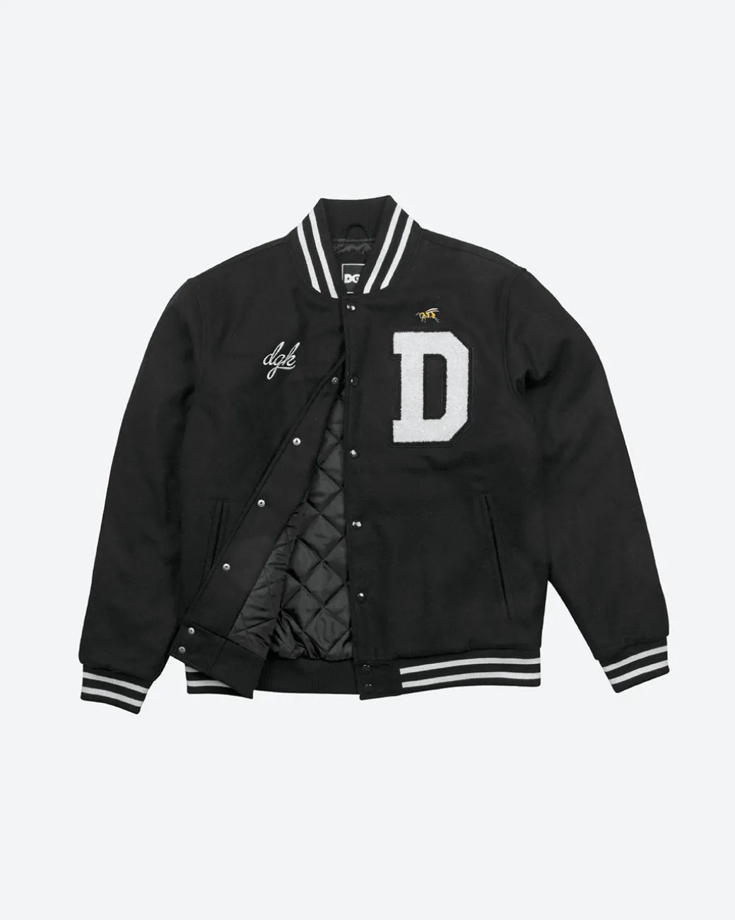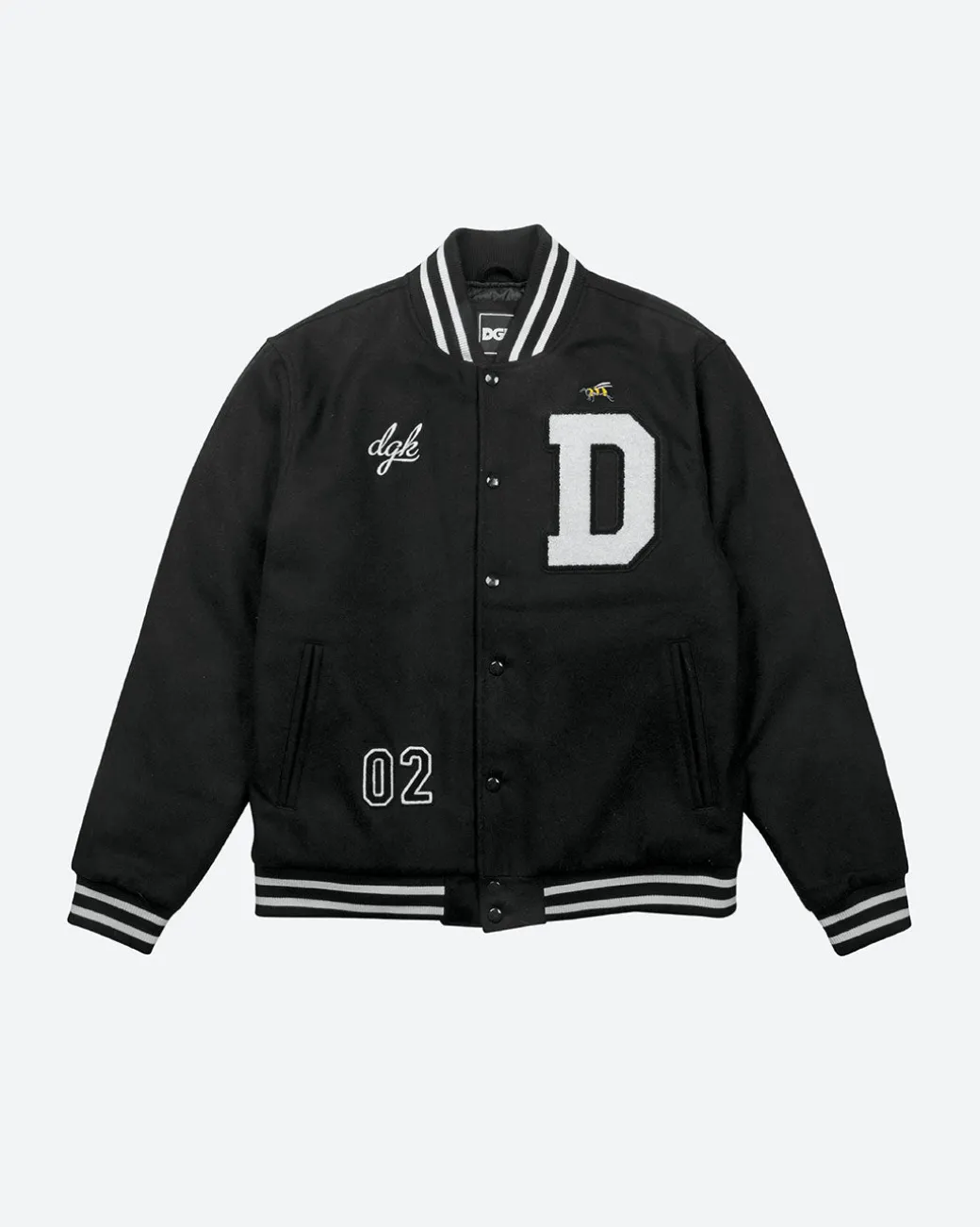 24 ounce 60% Melton Wool 40% Poly Blend / Classic Varsity Style Satin Quilt Lining with filling / Full Snap Front /Custom Chenille Patches and Embroideries throughout garment / Yarn Dye 2×2 Stripe Ribbing collar and cuffs / Double Welt Front Pockets / Logo Snap Closure / Interior Chest Pocket