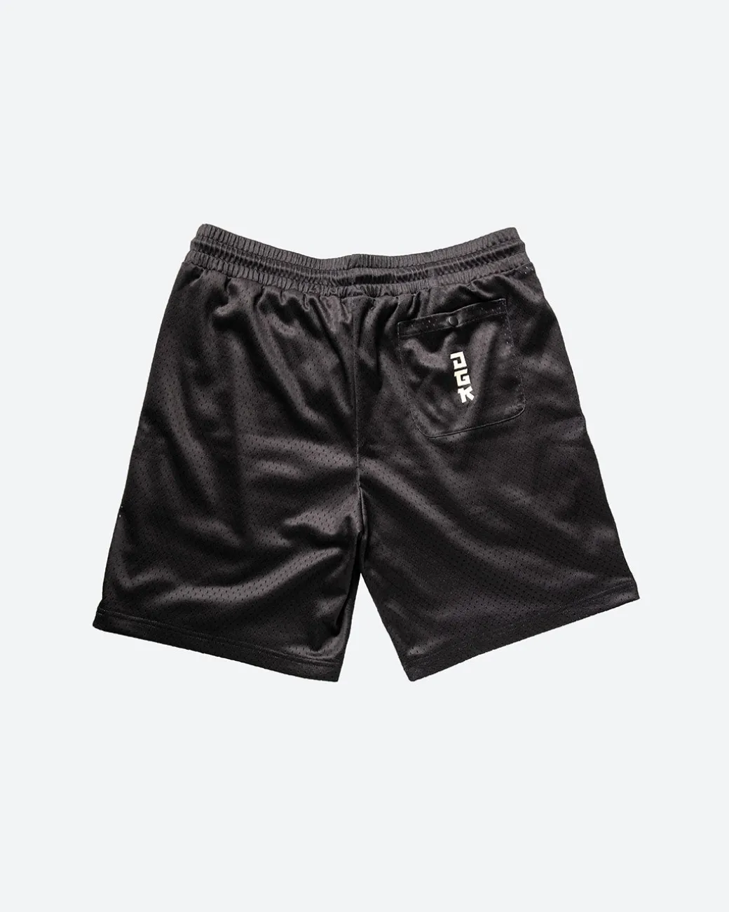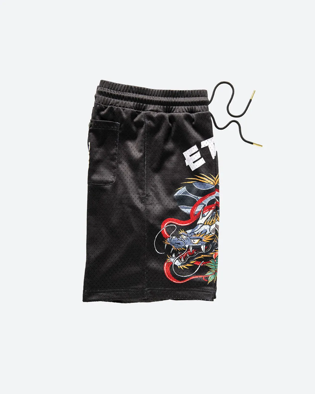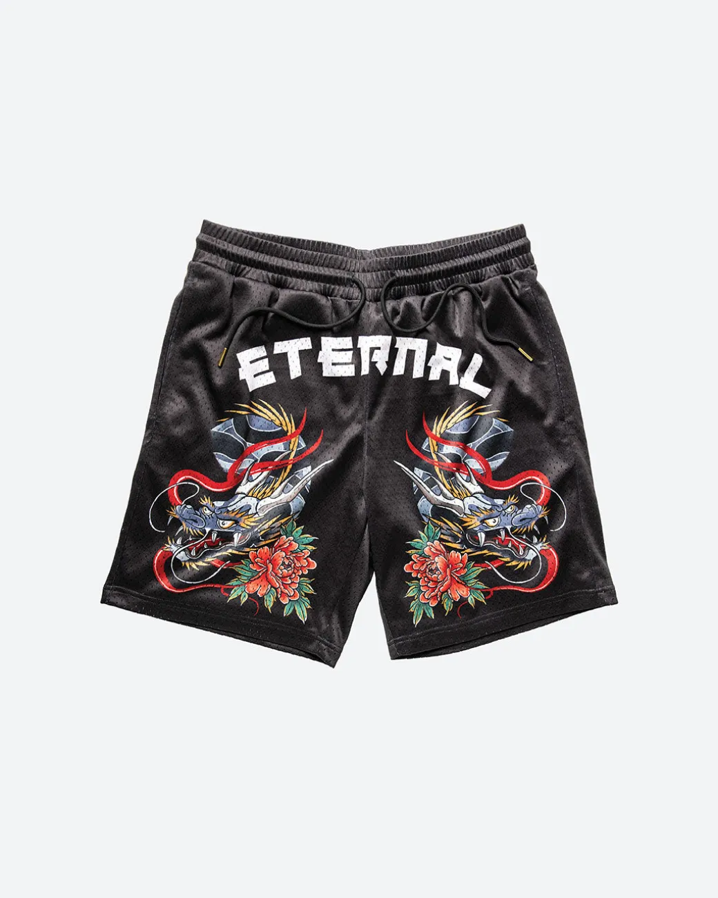100% Poly Sport Mesh / Lounge Style Short / Elastic Waistband / Side Body Pockets /Thigh Applique Art / Drawcord Waist
