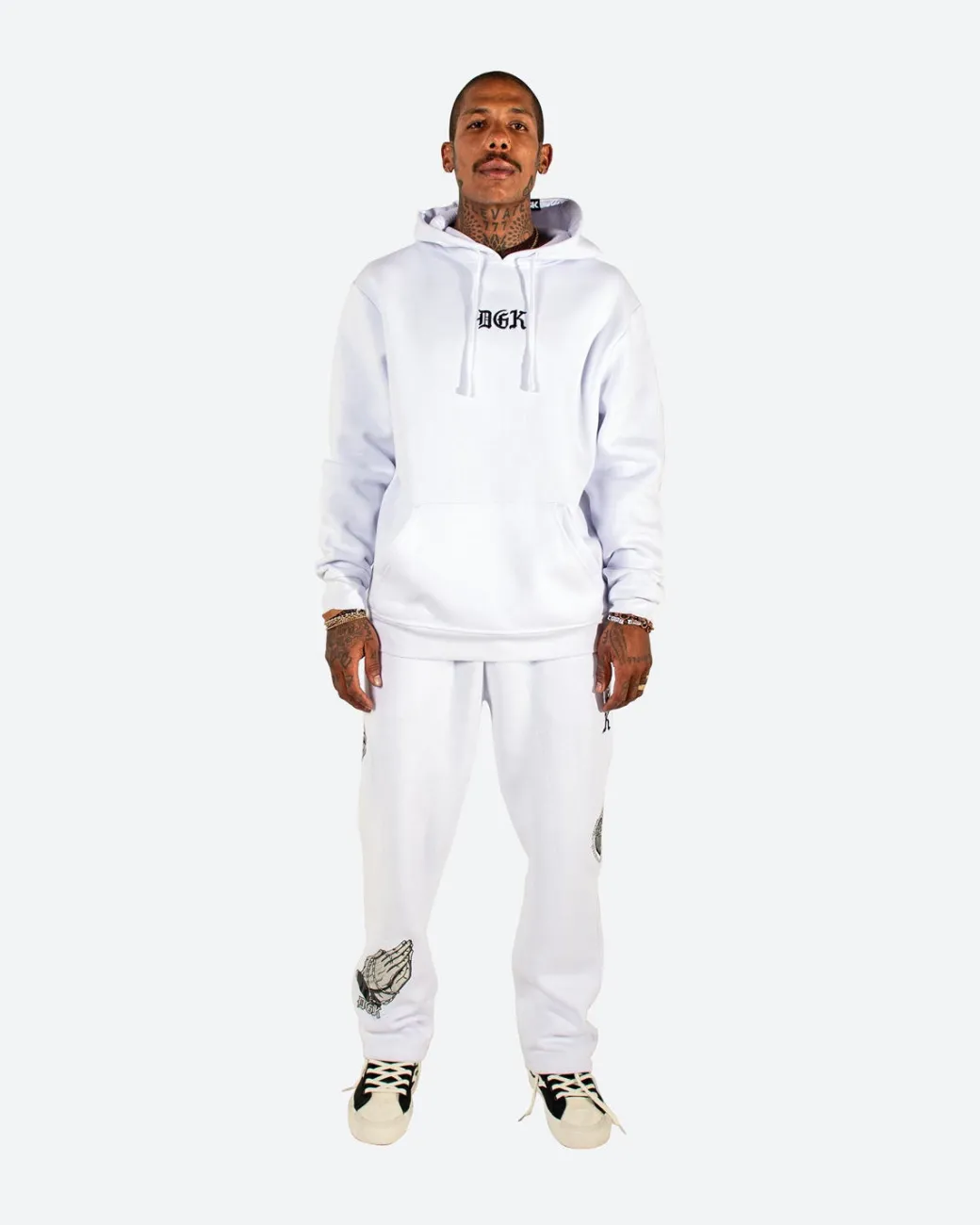 80% Cotton 20% Poly Fleece / Pullover Classic Style Hood / 380gsm Heavy Weight Fleece / Small Chest Embroidery Art / Multiple Back Embroidery Art / Lower Front Pouch Pocket Elastic Cuffs and Hem / Drawcord Hood