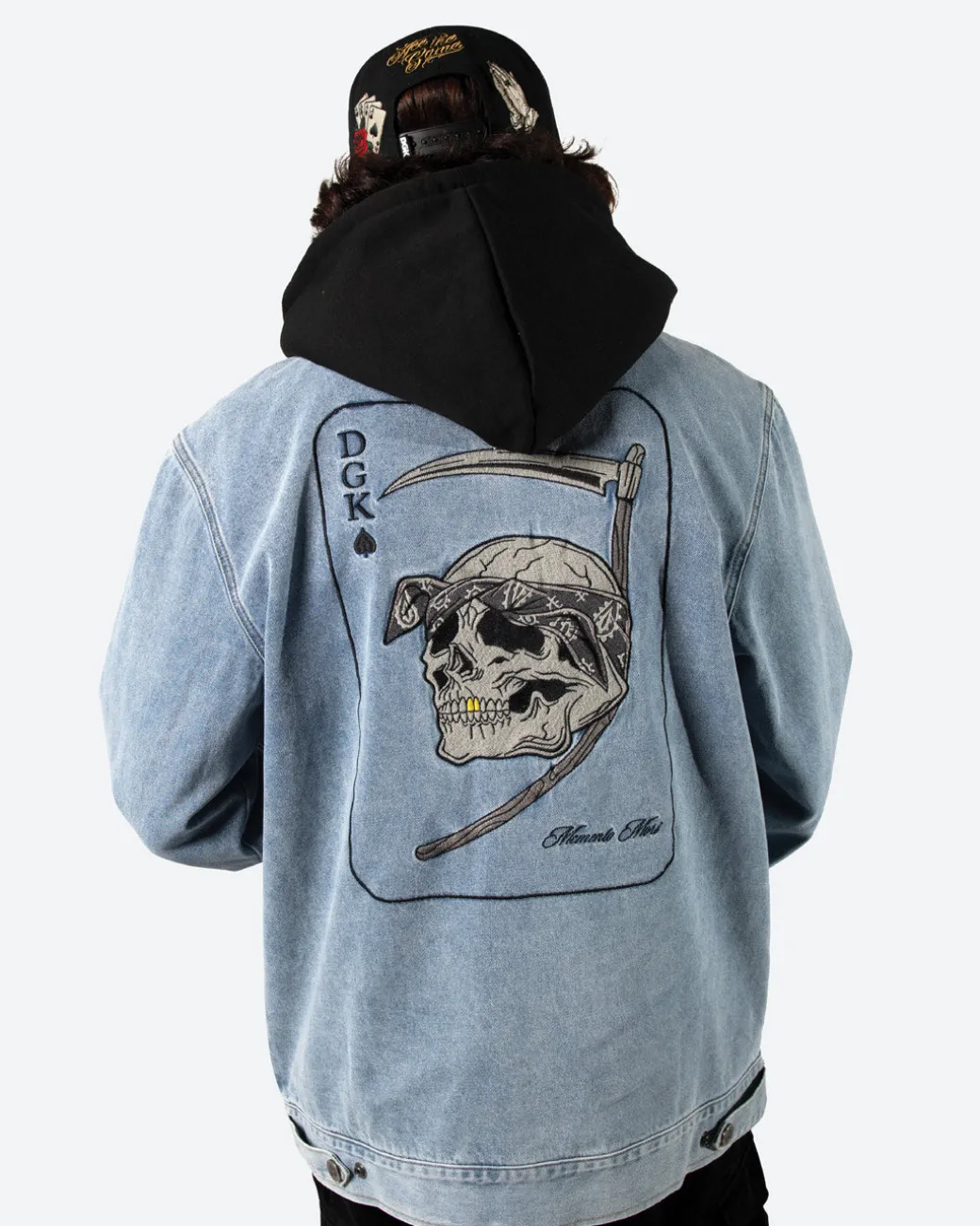 100% Cotton Twill Jacket / Hooded Bomber Style / Vintage Wash / Back Embroidery Art / Small Front Embroidery Art / Body Lining / Fleece Hood / YKK Front Zipper / Lower Front Pockets / Sleeve Pocket Detail / Ribbed Hem and Cuffs