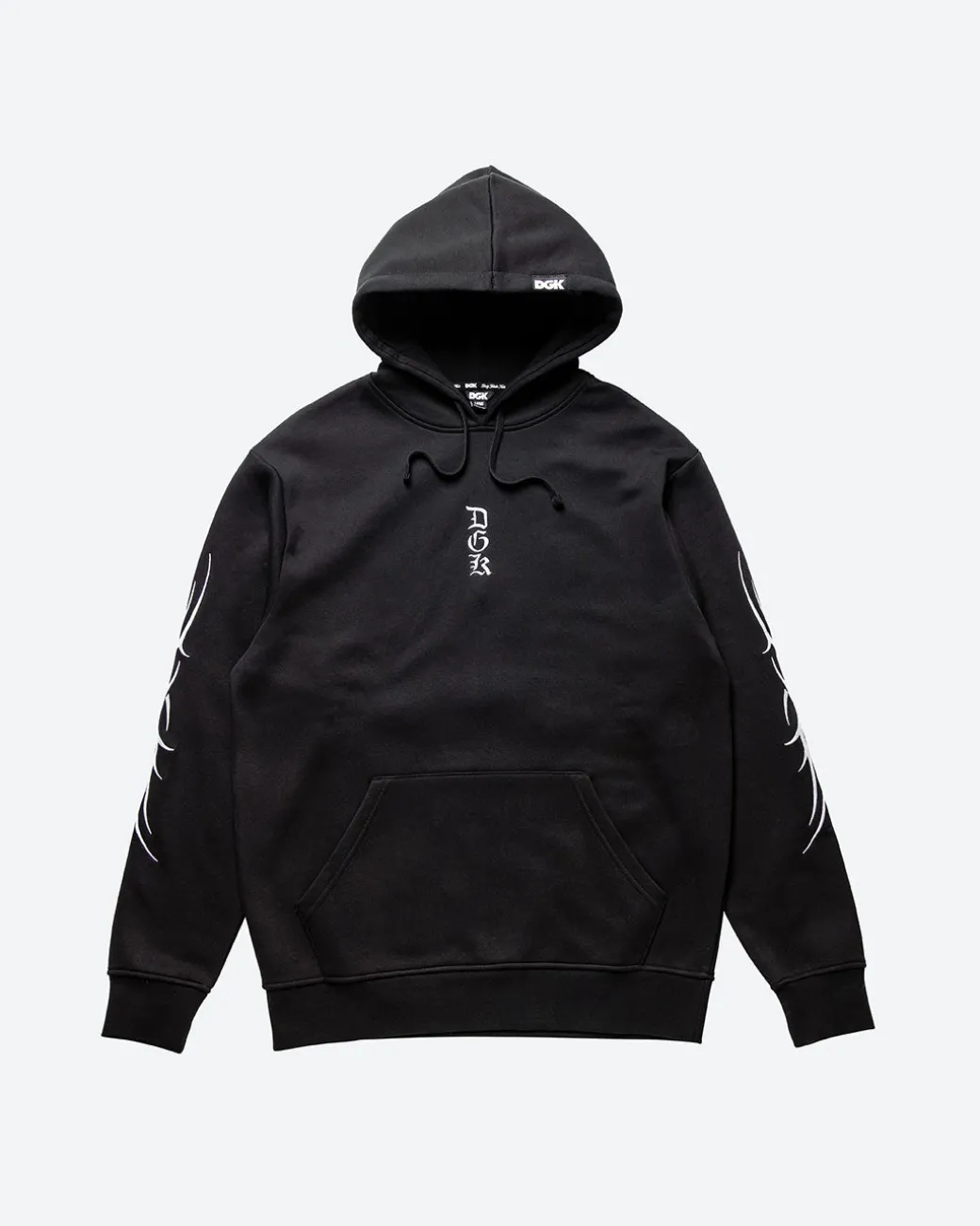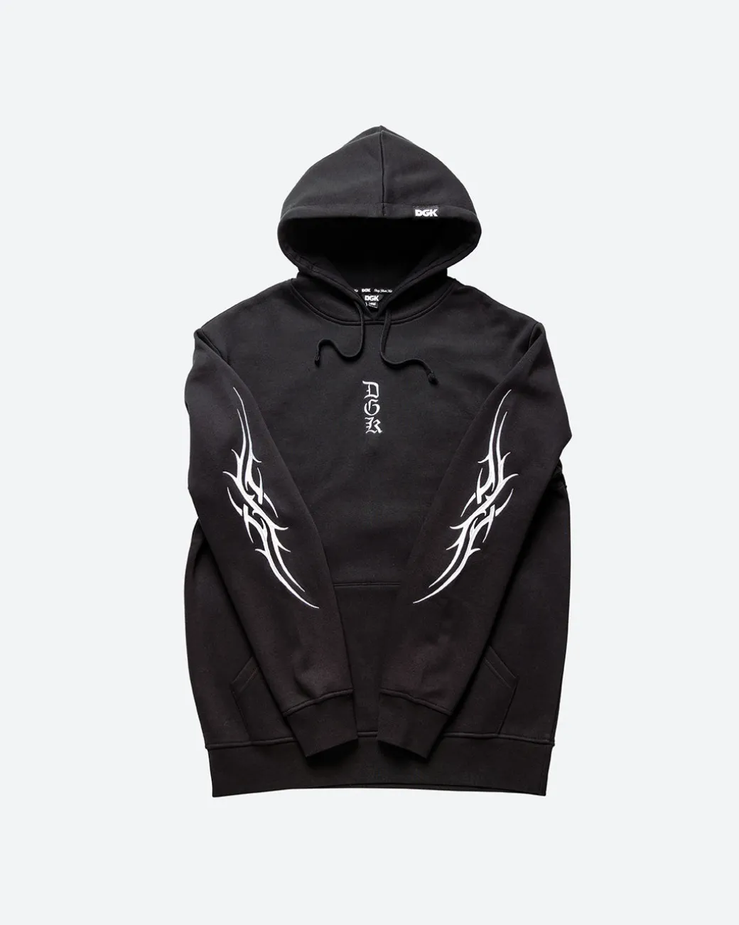 Hooded Fleece / Color: Black and White / 80% Cotton 20% Poly Fleece / Pullover Classic Style Hood / 380gsm Heavy Weight Fleece / Small Chest Embroidery Art / Back Embroidery Art / Arm Embroidery Art / Elastic Cuffs and Hem / Drawcord Hood